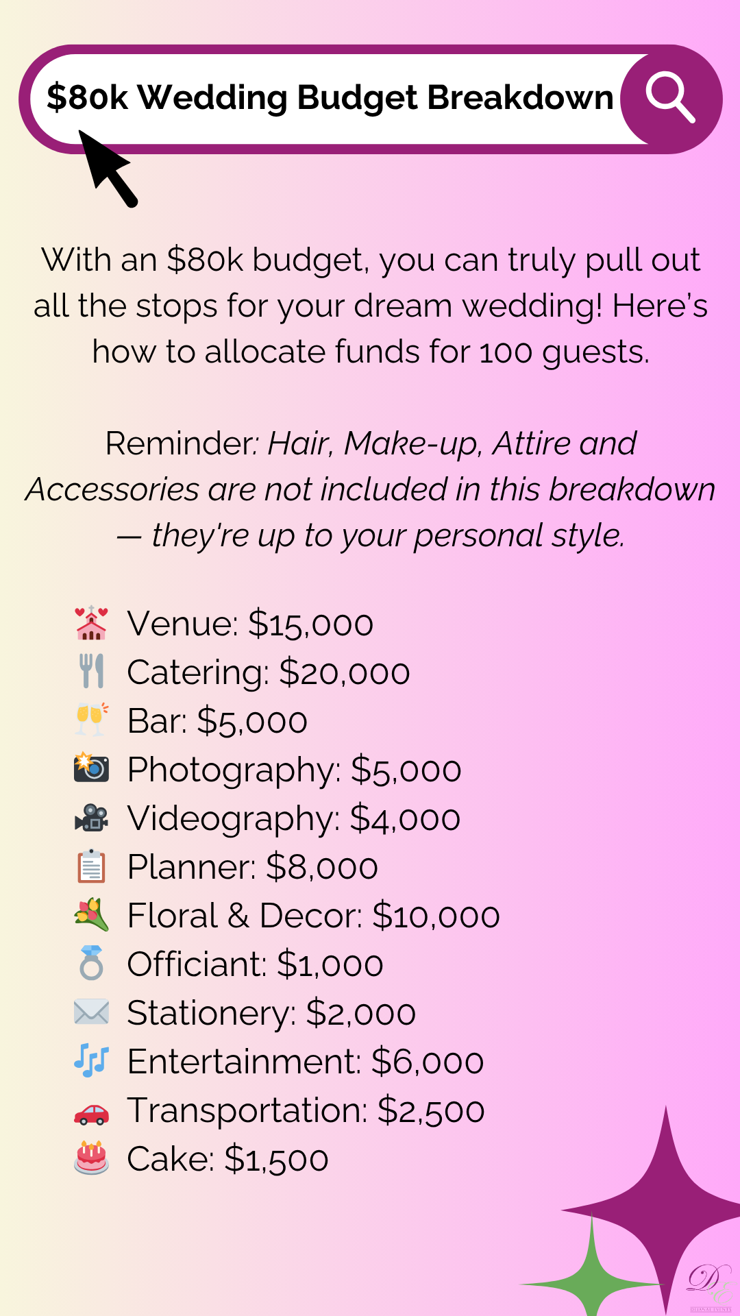 Congratulations on your engagement! Planning your wedding is an exciting time, but let’s be honest, discussing the budget can feel a little overwhelming. Whether you’re working with $10,000 or $100,000, this blog is here to guide you through realistic and thoughtful ways to allocate your funds. This post will break down a $80,000 budget level, showing you what’s possible while helping you prioritize what matters most to you both. No fluff, just honest guidance to help you plan a day that reflects your love and your lifestyle.